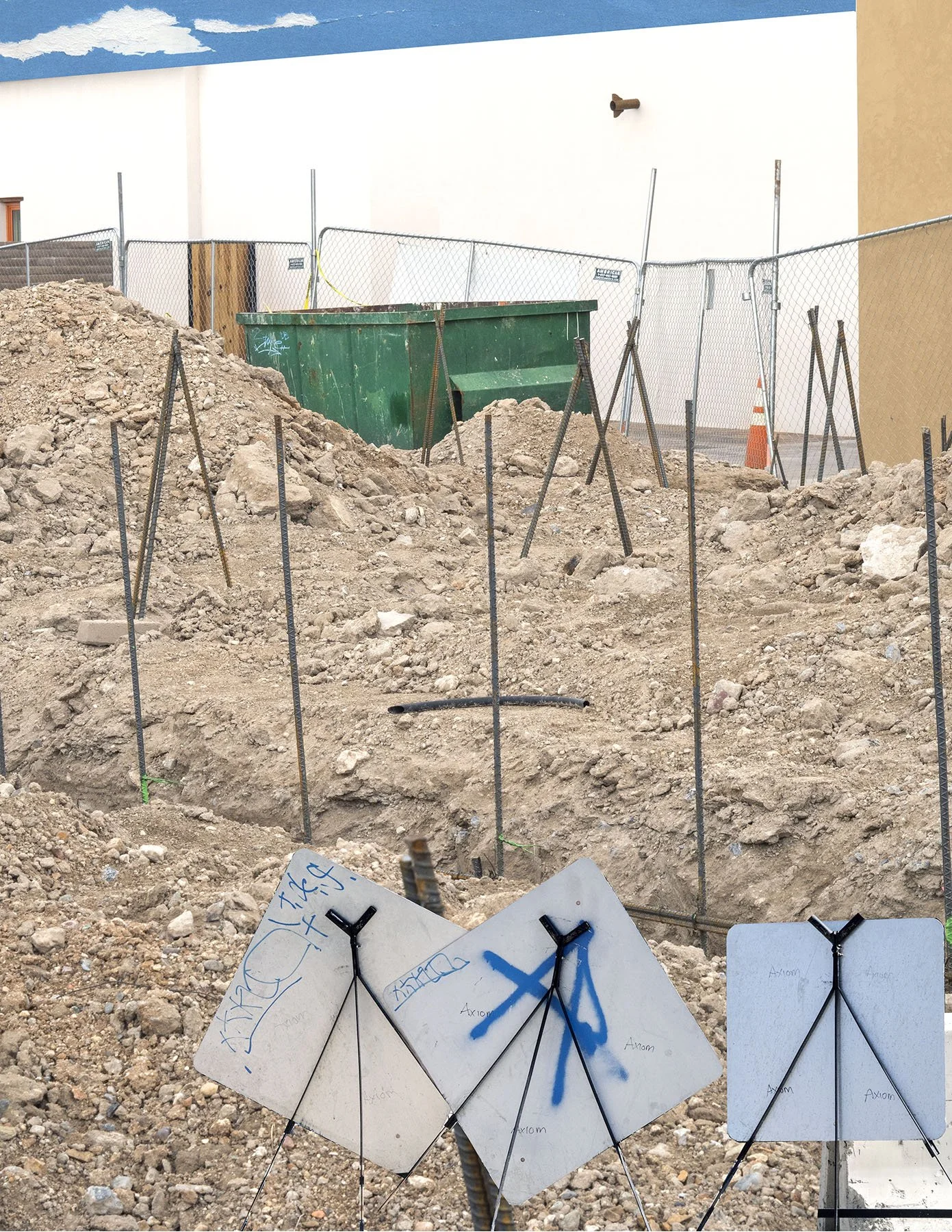 My collage process allows me to tease out the visual rhythms of these spaces, While construction zones don’t hold our memories and associations in the same way that architecture does, they hold a sense of past, present and future time. Construction zones are the forward momentum of cities made visible. In these collages, I present an exuberant and expansive view of the feeling that construction zones bring to urban space.